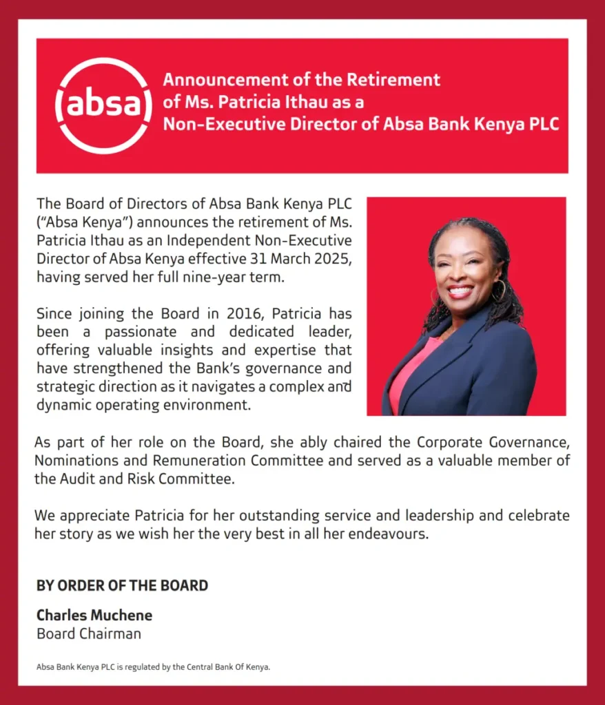 Absa Bank Kenya PLC announces the retirement of Ms. Patricia Ithau as an Independent Non-Executive Director, effective 31st March 2025. Patricia joined the Board in 2016.