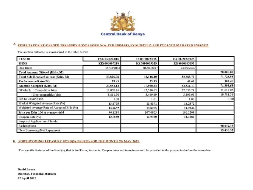 CBK successfully raised KSh. 71.398 billion through the re-opening of three Treasury bonds. The auction attracted total bids worth KSh. 71.728 billion, slightly exceeding the target amount of KSh. 70 billion.