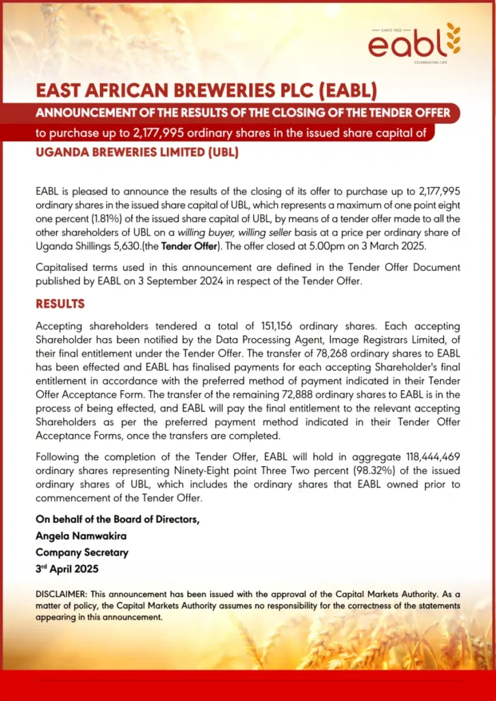 EABL successfully closed its tender offer to buy shares in Uganda Breweries Ltd (UBL). A total of 151,156 shares were tendered, with 78,268 shares already transferred and payments made. The remaining 72,888 shares are in process, with payments to follow. After completion, EABL will own 98.32% of UBL.