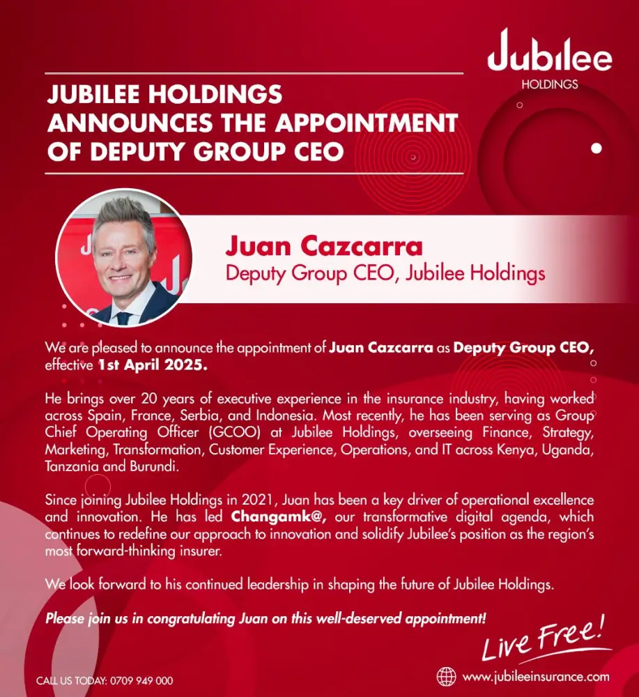 Jubilee Holdings has appointed Juan Cazcarra as its new Deputy Group CEO. With over 20 years of experience in the insurance industry, Juan has played a key role at Jubilee as the Group Chief Operating Officer (GCOO), leading major initiatives like Changamk@, the company’s digital transformation agenda.