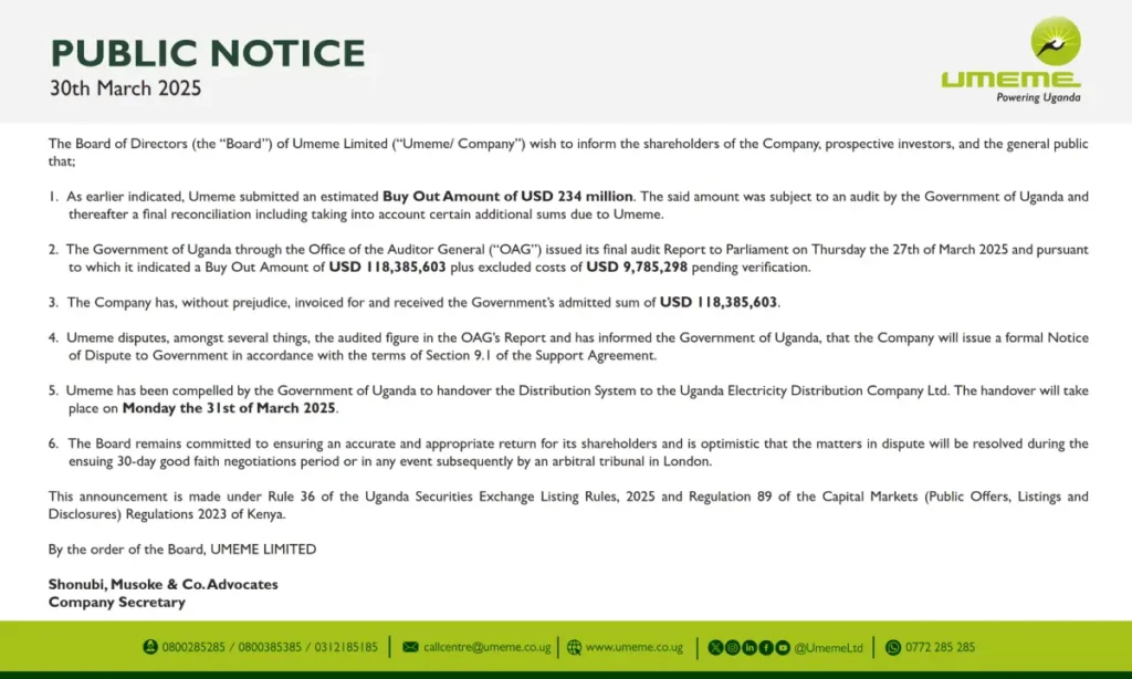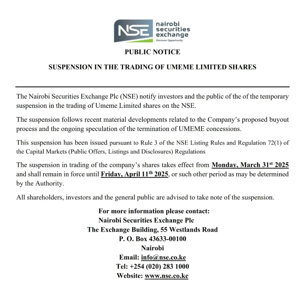 The Nairobi Securities Exchange has temporarily suspended trading of Umeme Limited shares from 31st March 2025 to 11th April 2025. This follows developments related to the company’s buyout and concession issues.