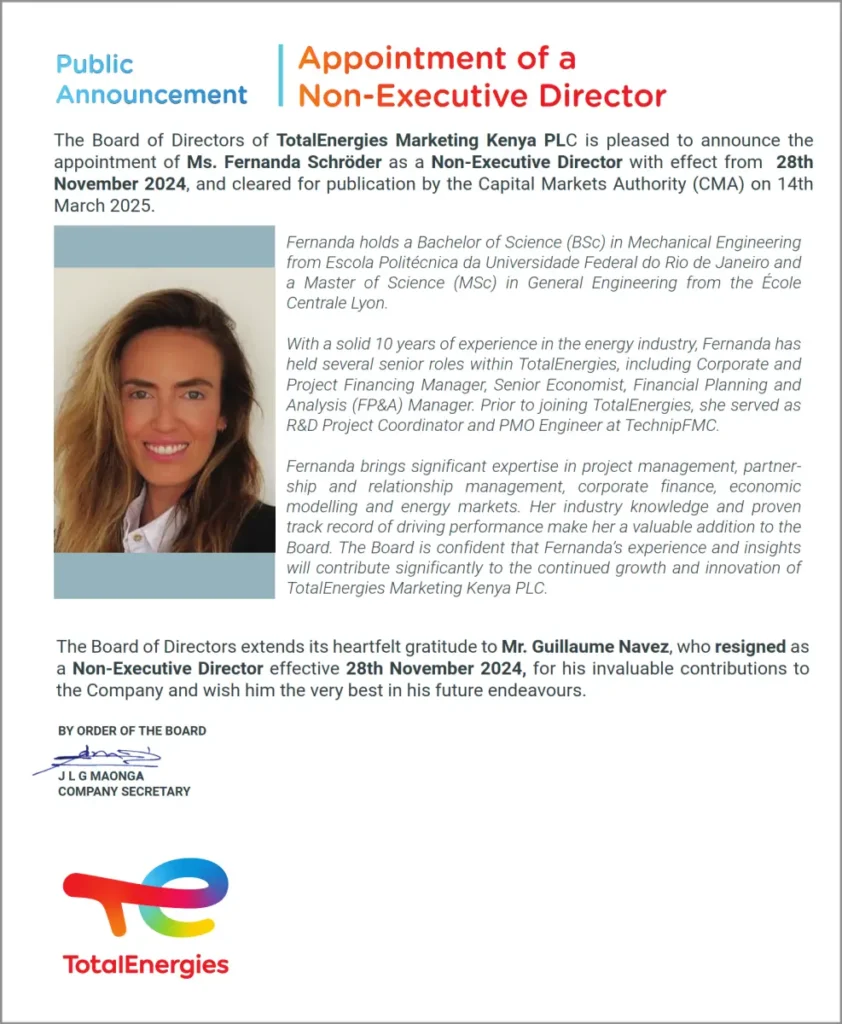 TotalEnergies Marketing Kenya PLC has appointed Ms. Fernanda Schröder as a Non-Executive Director. Fernanda brings over 10 years of experience in the energy industry, having held key roles at TotalEnergies and TechnipFMC.