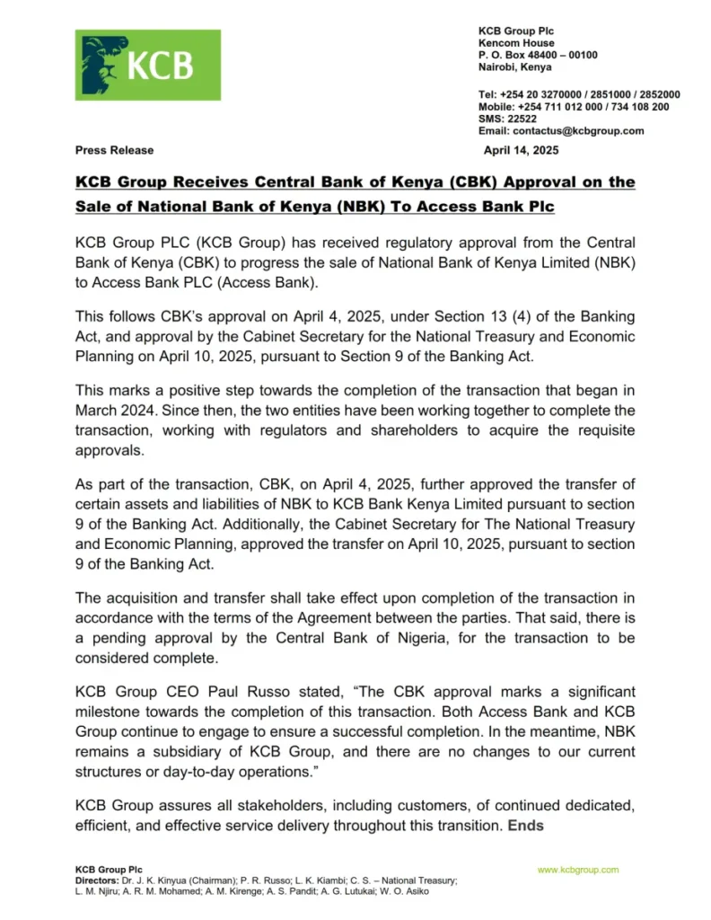 CBK Approves NBK Sale to Access Bank. The Central Bank of Kenya approved KCB Group’s sale of National Bank of Kenya (NBK) to Access Bank Plc, marking a positive step towards completing the transaction that began in March 2024.