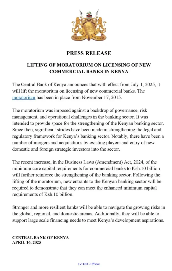 CBK Lifts Moratorium on Licensing of New Banks. From July 1st 2025, Kenya will allow new commercial banks to be licensed, following the lifting of a 10-year ban. These banks must meet the capital requirement of KSh. 10 billion.