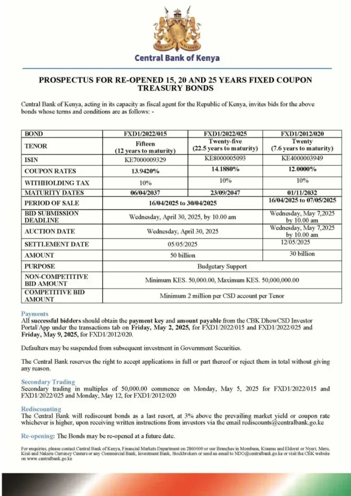CBK Re-Opens Three Fixed Coupon Bonds. The Central Bank has re-opened and invited bids for FXD1/2022/015, FXD1/2022/025, and FXD1/2012/020 fixed coupon treasury bonds. Bids for the 15 and 20-year bonds are due on 30th April, 2025, while bids for the 20-year bond are due on 7th May, 2025.