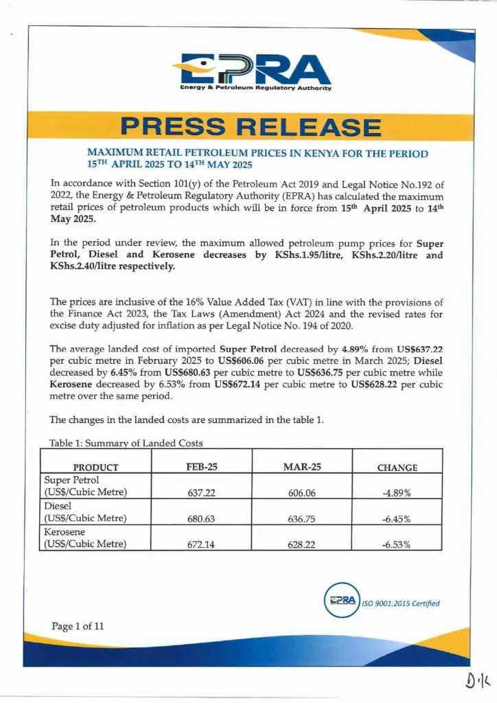 EPRA Announces Fuel Price Reduction. Good news for motorists! EPRA lowered fuel prices effective April 15th to May 14th, 2025.