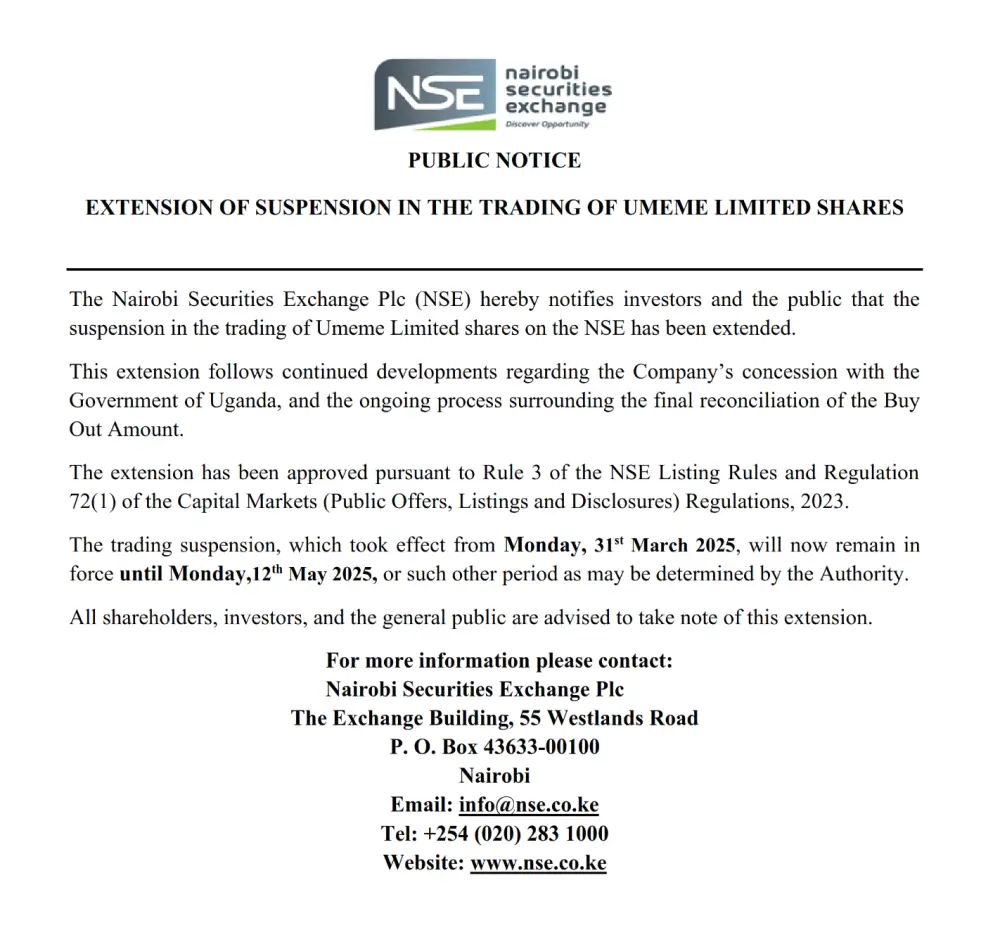 NSE Extends the Suspension of Umeme Limited Shares. The trading suspension, which began on March 31st, 2025, will now continue until May 12th, 2025, or as otherwise determined by the Authority. This extension follows ongoing developments regarding the company’s concession with the Government of Uganda and the Buy Out process.