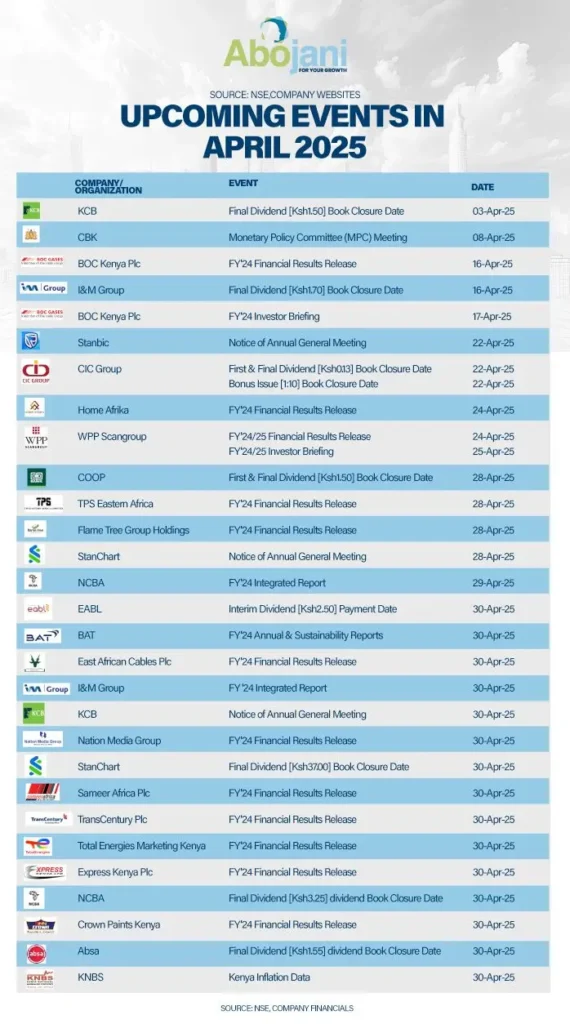- CIC Group Book Closure — First and final KSh. 0.13/share dividend + 1-for-10 bonus issue. April 22, 2025.