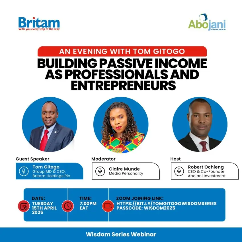Wisdom Series with Tom Gitogo – Abojani x Britam. We had another successful #WisdomSeries webinar, featuring Tom Gitogo, Group MD & CEO of Britam Holdings. With quiet confidence, he shared his wealth of knowledge which the audience could use in their everyday lives. Here are a few gems he shared: