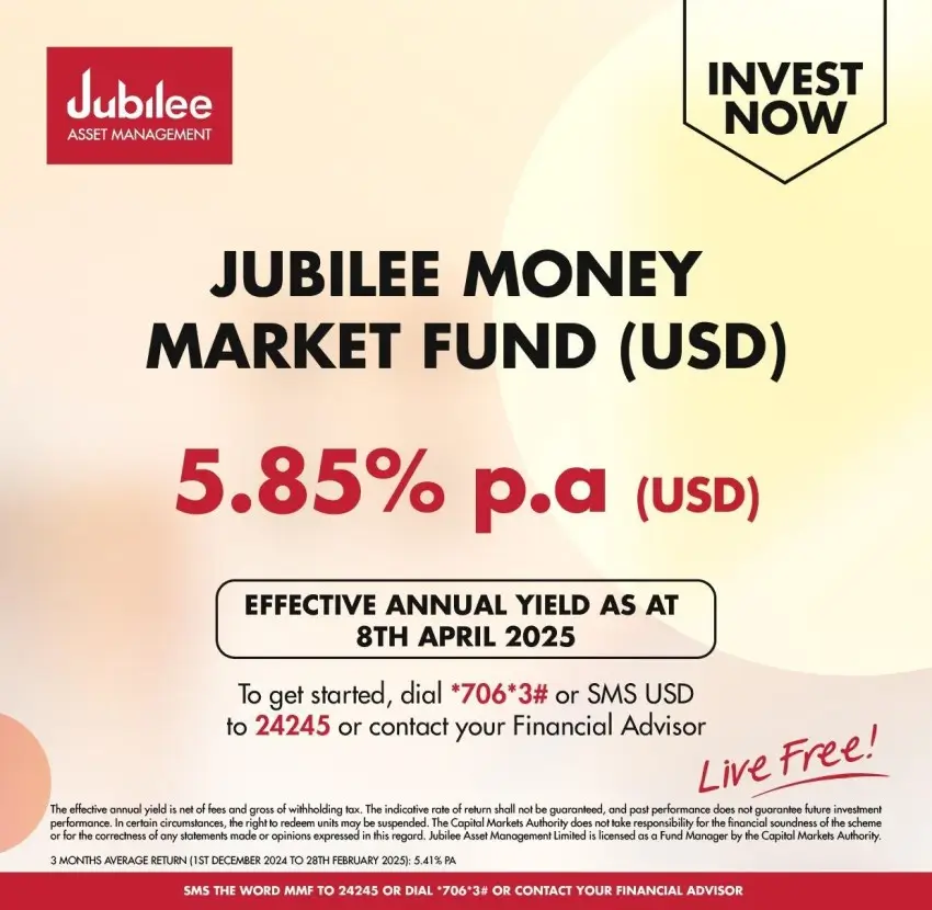 To get started on the Jubilee Money Market Fund, SMS the word MMF to 24245 or dial *706*3# to talk to a Financial Advisor.