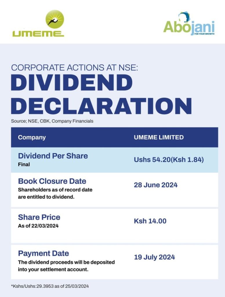 Shareholders registered in Umeme Ltd‘s books as of 28th June 2024 are eligible to receive a dividend of UGX 54. 20 (KES 1.84) per share, around 19th July 2024.