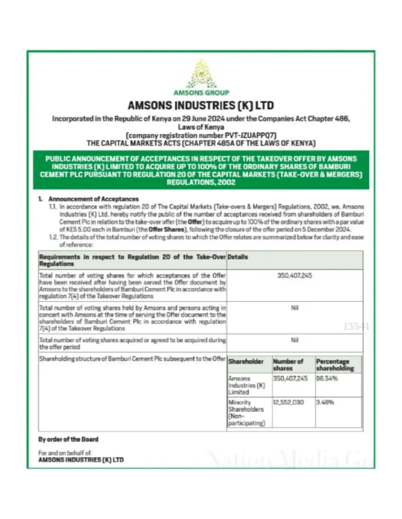 2. Amsons Industries (K) Ltd. announced the results of its takeover offer for Bamburi Cement Plc. The company now owns 96.54% of Bamburi Cement Plc, with minority shareholders holding the remaining 3.46%.