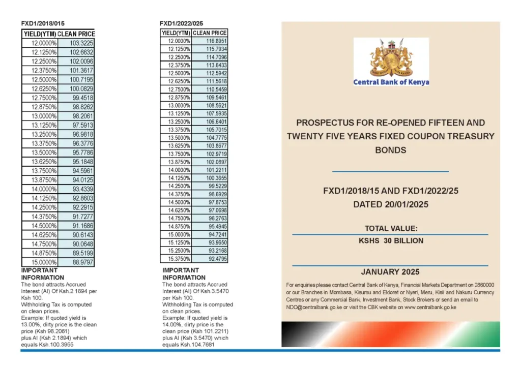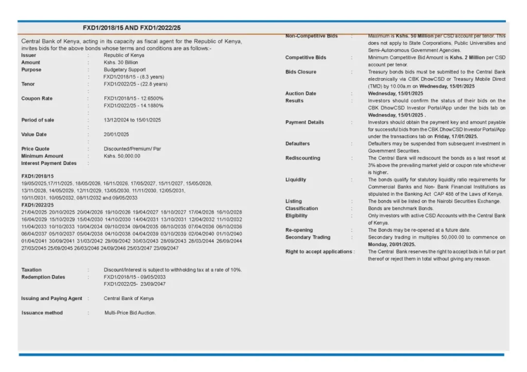 6. CBK is seeking to raise Sh 30 billion from re-opened fixed-coupon Treasury bonds (FXD1/2018/15 and FXD1/2022/25) for budgetary support. The 15-year and 25-year bonds have coupon rates of 12.65% and 14.188%, respectively. Bids close on 15 January 2025.