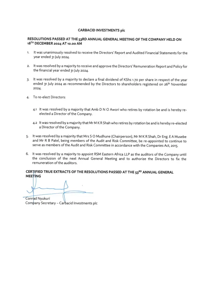Carbacid Investments Plc held its 53rd AGM on December 18, 2024, and approved several key resolutions.