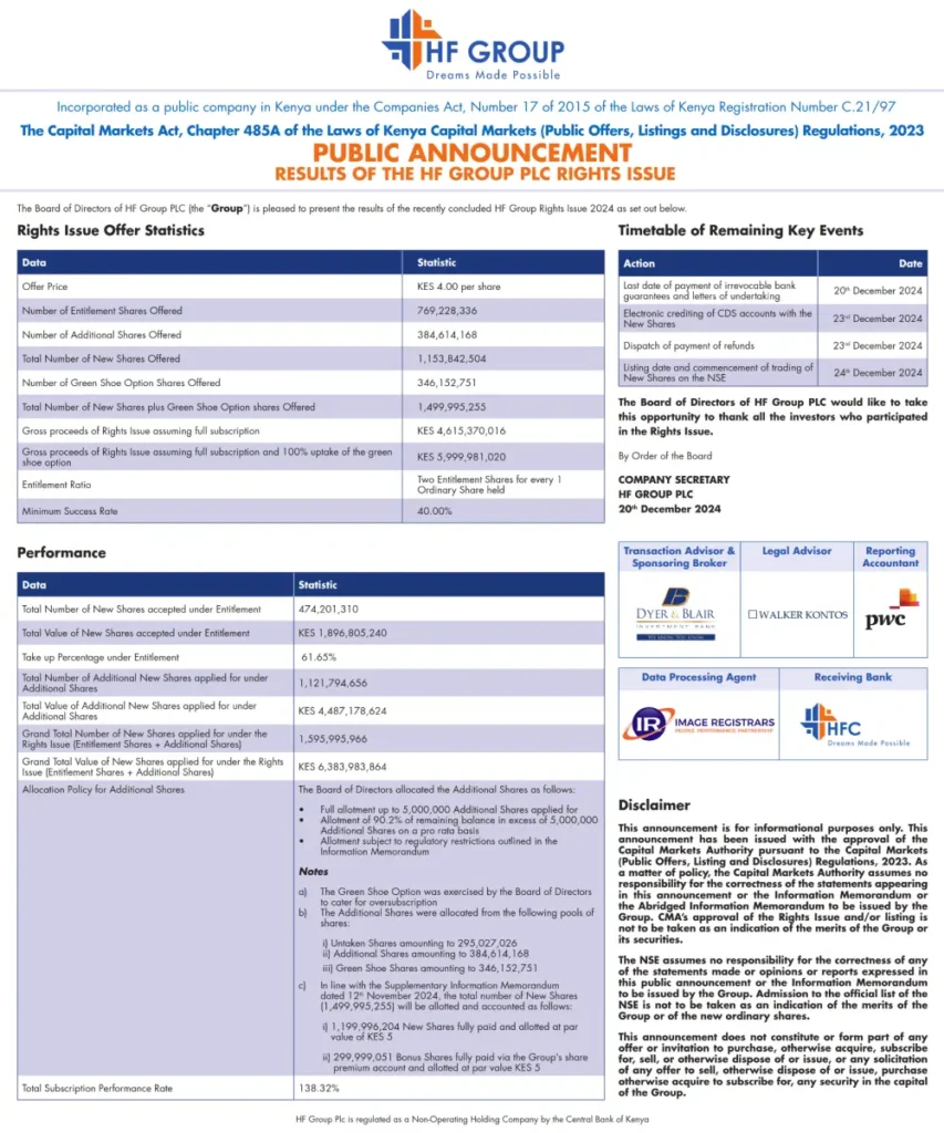 1. HF Group rights issue was oversubscribed by 38.32%, attracting Ksh6.4 billion in offers, surpassing the initial target of Ksh4.6 billion.