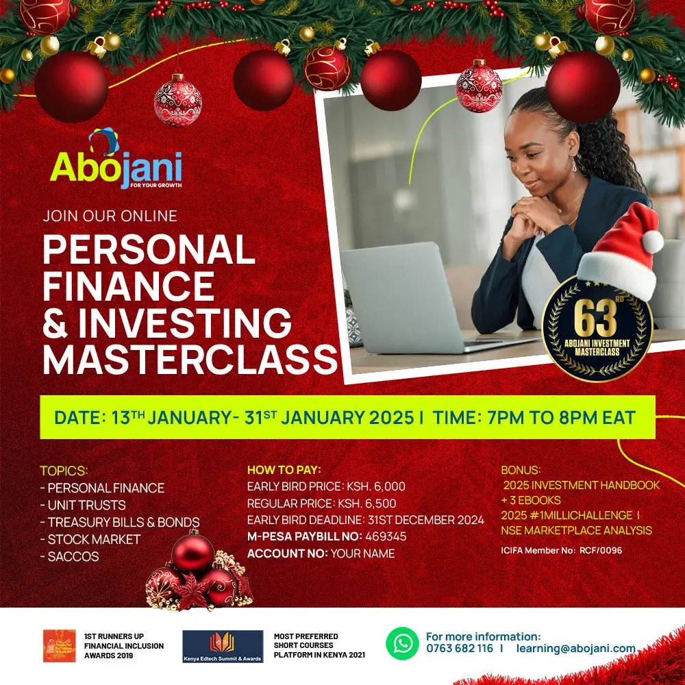 And lastly, if you missed our 62nd Masterclass, join Abojani’s 63rd masterclass to learn about personal finance, the stock market, SACCOs, MMF, bonds, and much more from 13th to 31st Jan 2025.