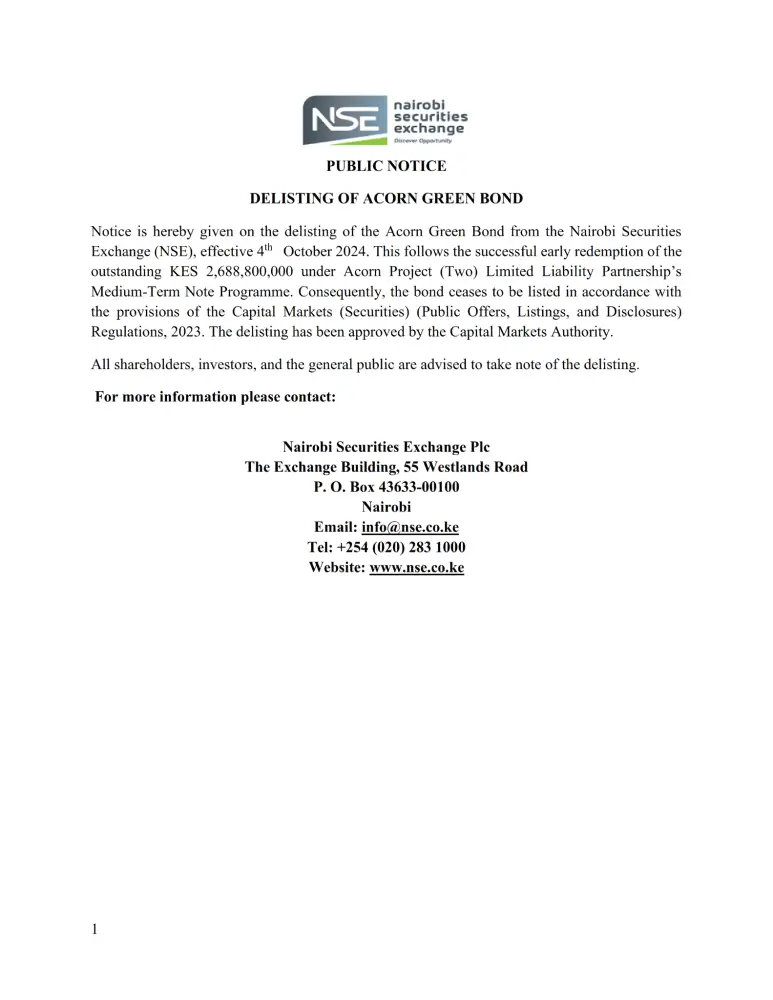 3. NSE PLC delisted the Acorn Green Bond, effective October 4, 2024. This follows the successful early redemption of KES 2,688,800,000 under Acorn Project (Two) Limited Liability Partnership’s Medium-Term Note Programme.
