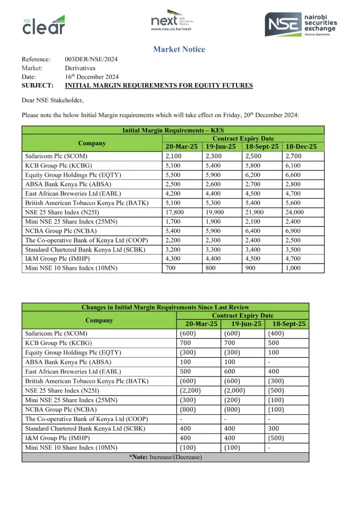4. NSE_PLC announced new initial margin requirements for equity futures, effective Friday, December 20, 2024. The changes affect several companies and indices, with varying increases and decreases in margin requirements across different contract expiry dates.